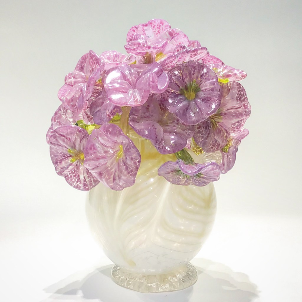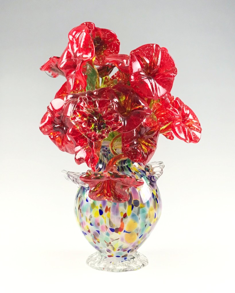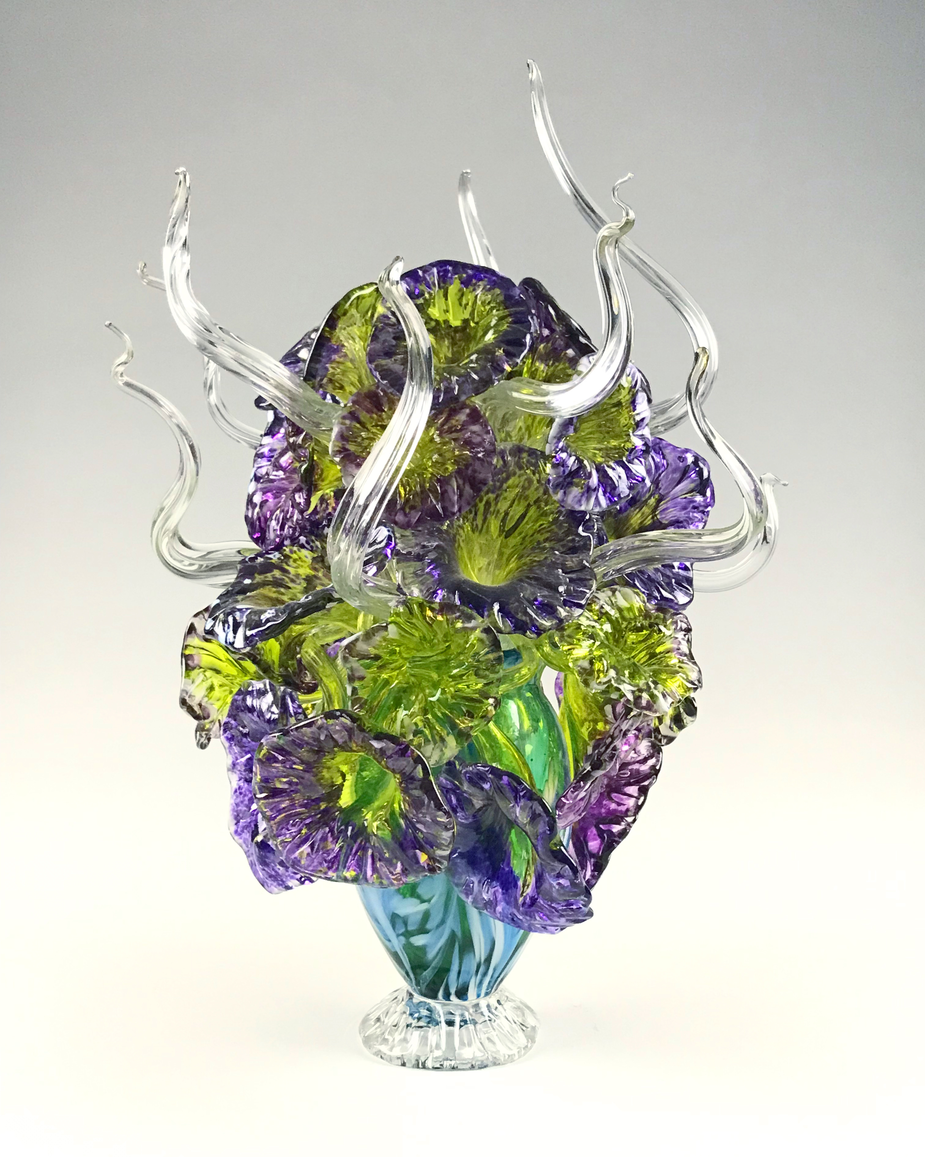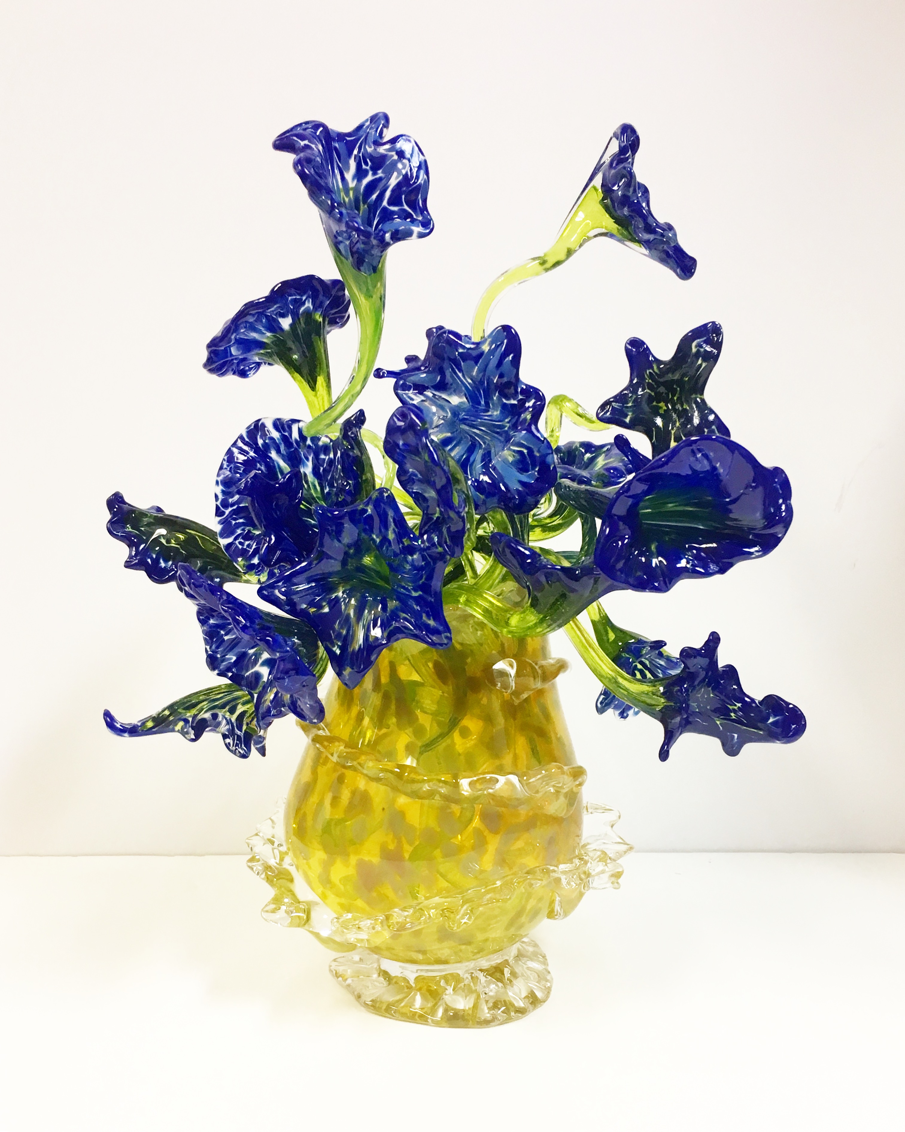 Flowers are the language of love, beauty, admiration, regret, apologies, and death. Yet they fade, withering into dust: just as ephemeral as the fleeting feelings they represent. With glass as a medium, I can ebb and flow with the heated moment and freeze within a second’s notice. In the right conditions, glass can survive for centuries or shatter into oblivion in a blink of an eye. In creating glass flowers and bouquets, I reach a sense of balance between forever and fragility. As it is my hope to live forever, I know I am a fragile human that can perish in a split second.