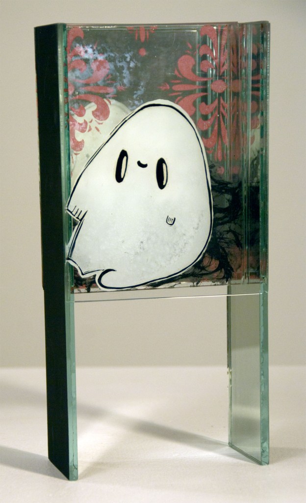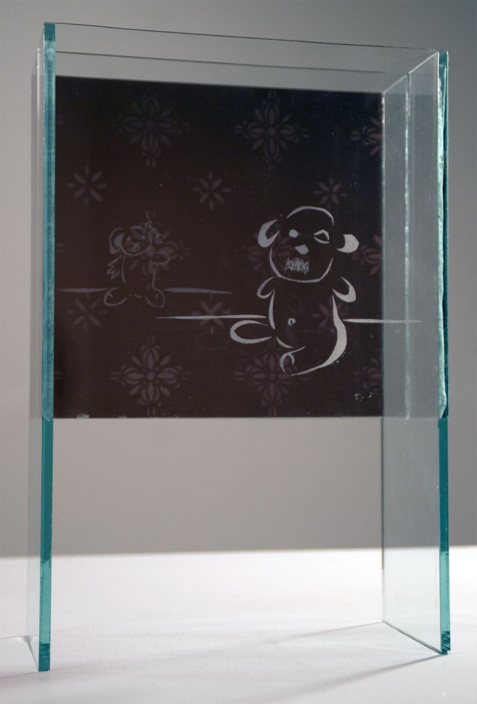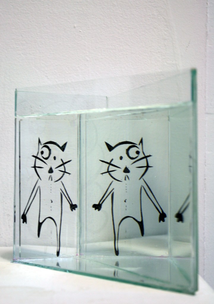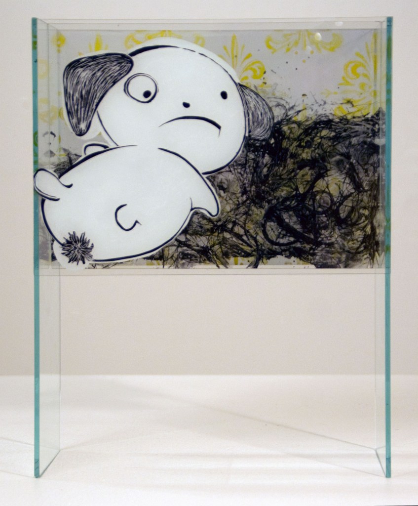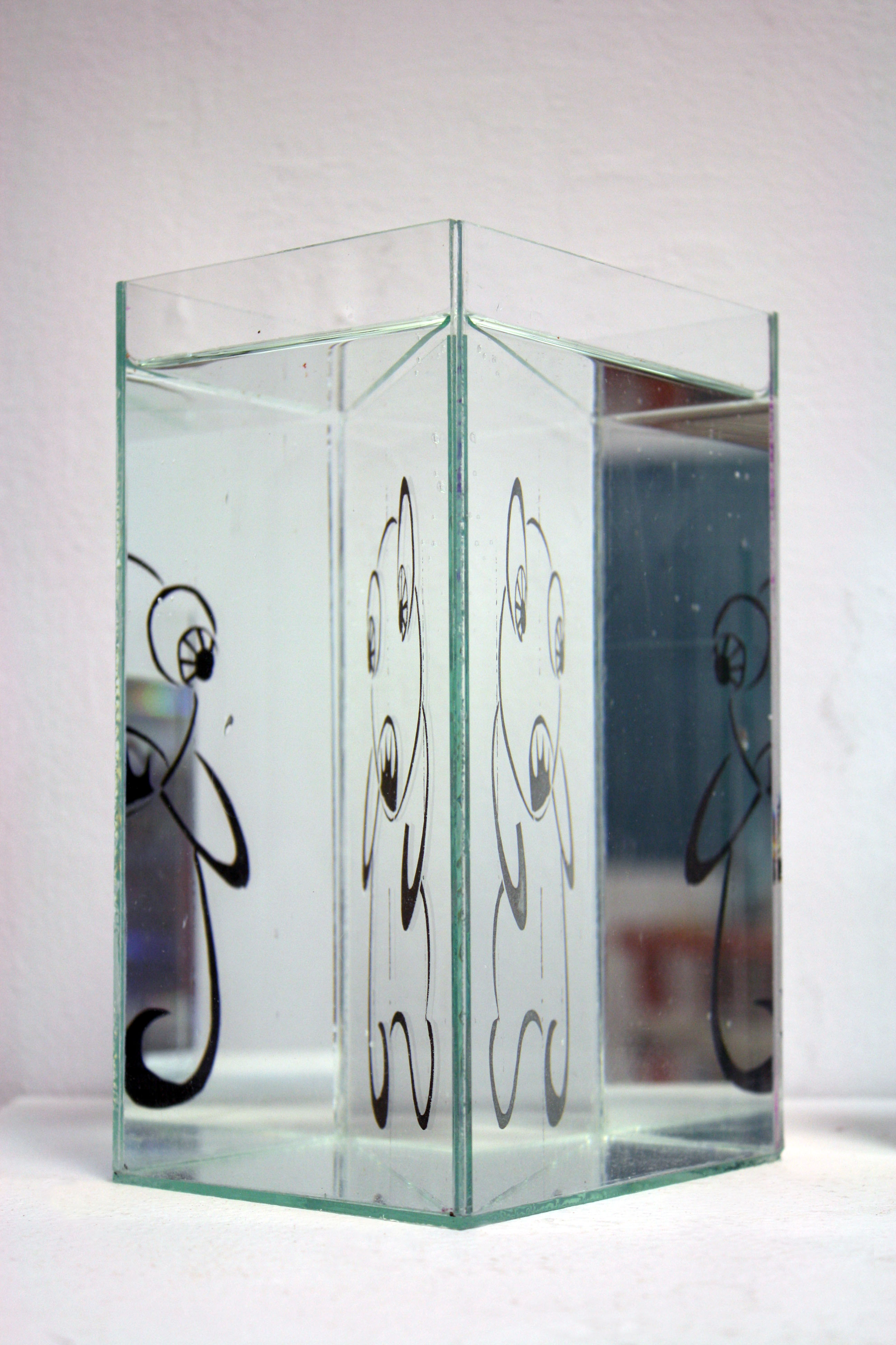 In my glass work, I create characters that embody a specific self-image. These mini self-portraits are created in moments of spontaneity, silliness, self-doubt and desperation. In this process of scribbles, I allow my mind to see what is between the lines: my emotions and irrational enjoyments/fears of life. I continue to capture these “selves” by placing them in a box (metaphorically the boxed worlds that we live in) where the “selves” exist between the 2nd and 3rd dimensions. It also allows me to see my “selves” in the context of social voyeurism: seeing how I am in society.
