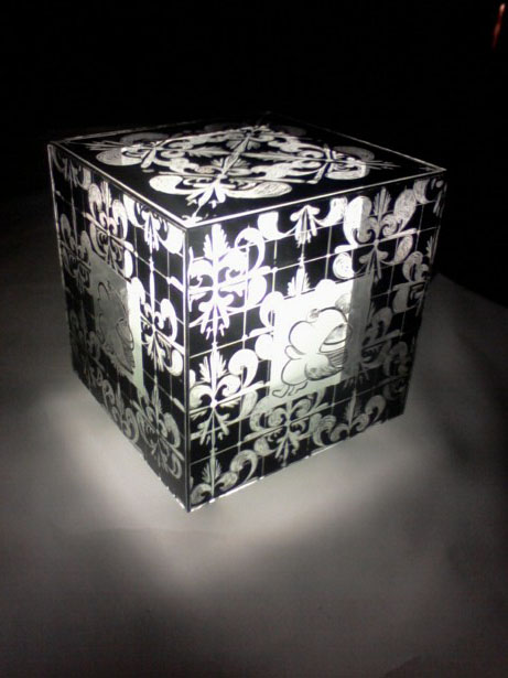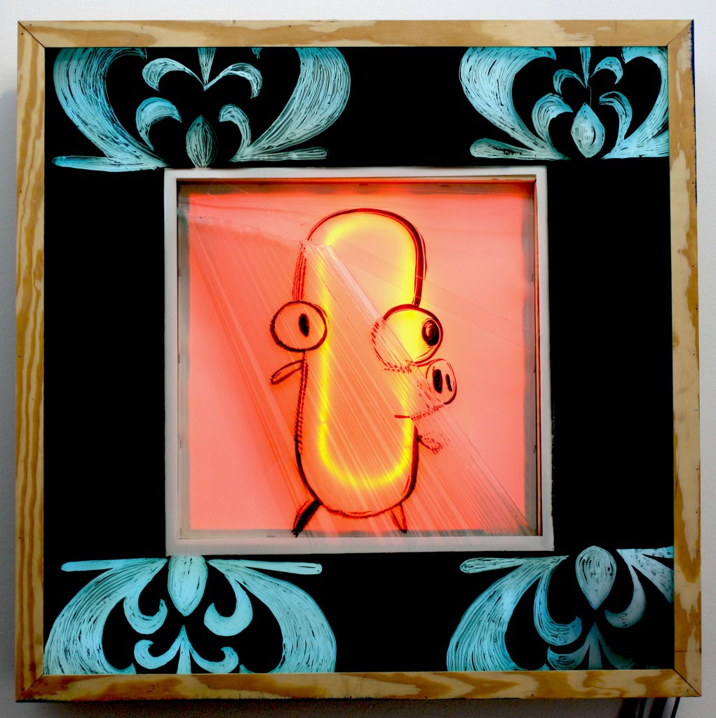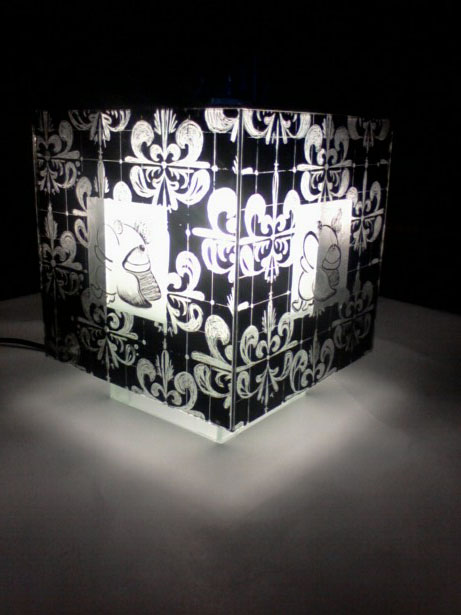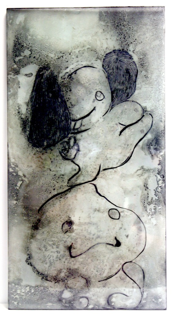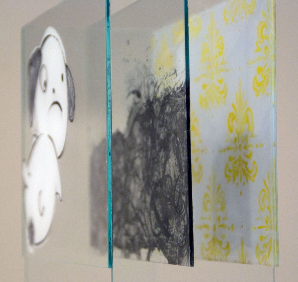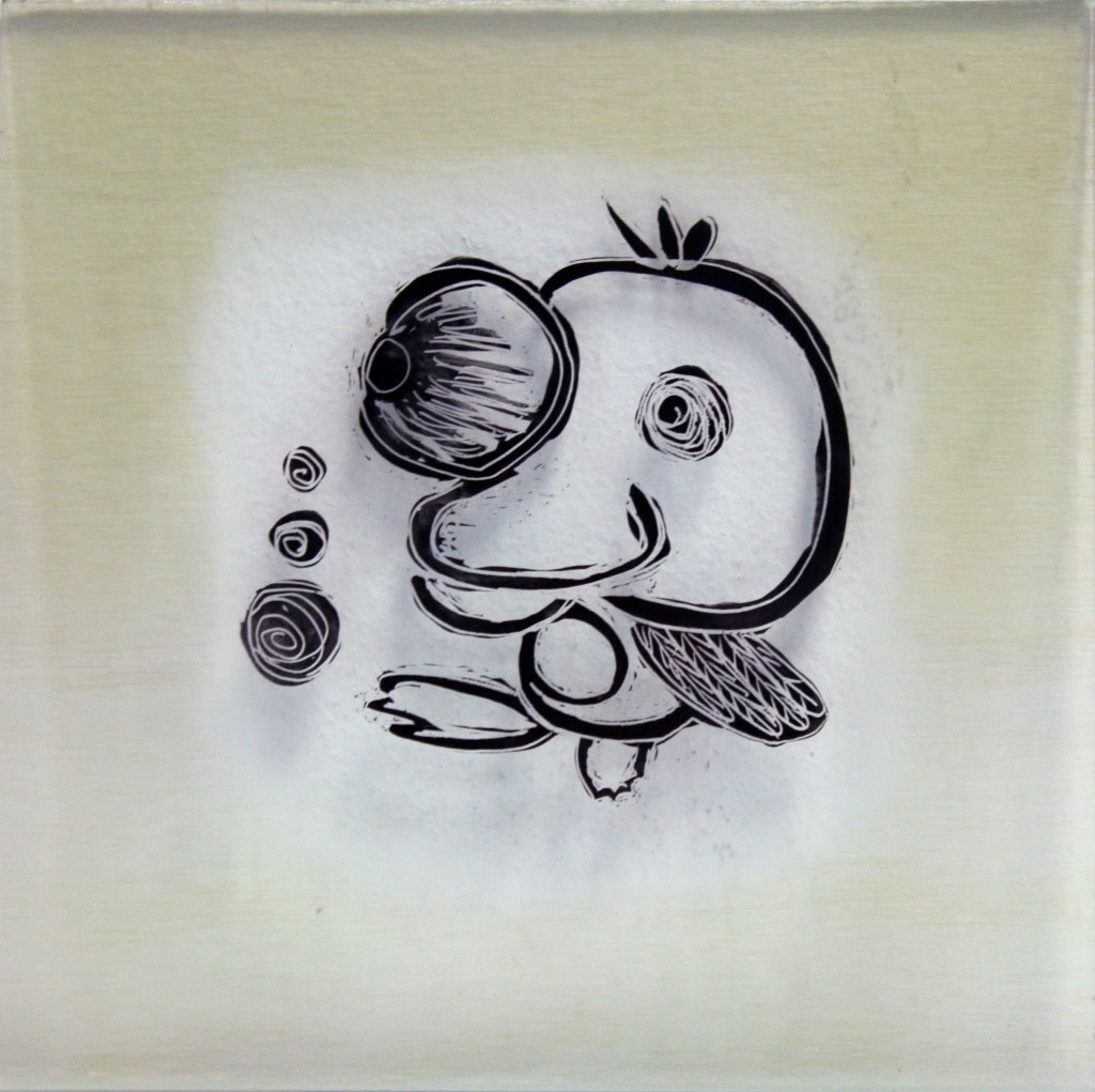 In my glass work, I create characters that embody a specific self-image. These mini self-portraits are created in moments of spontaneity, silliness, self-doubt and desperation. In this process of scribbles, I allow my mind to see what is between the lines: my emotions and irrational enjoyments/fears of life. I continue to capture these “selves” by placing them in a box (metaphorically the boxed worlds that we live in) where the “selves” exist between the 2nd and 3rd dimensions. It also allows me to see my “selves” in the context of social voyeurism: seeing how I am in society.