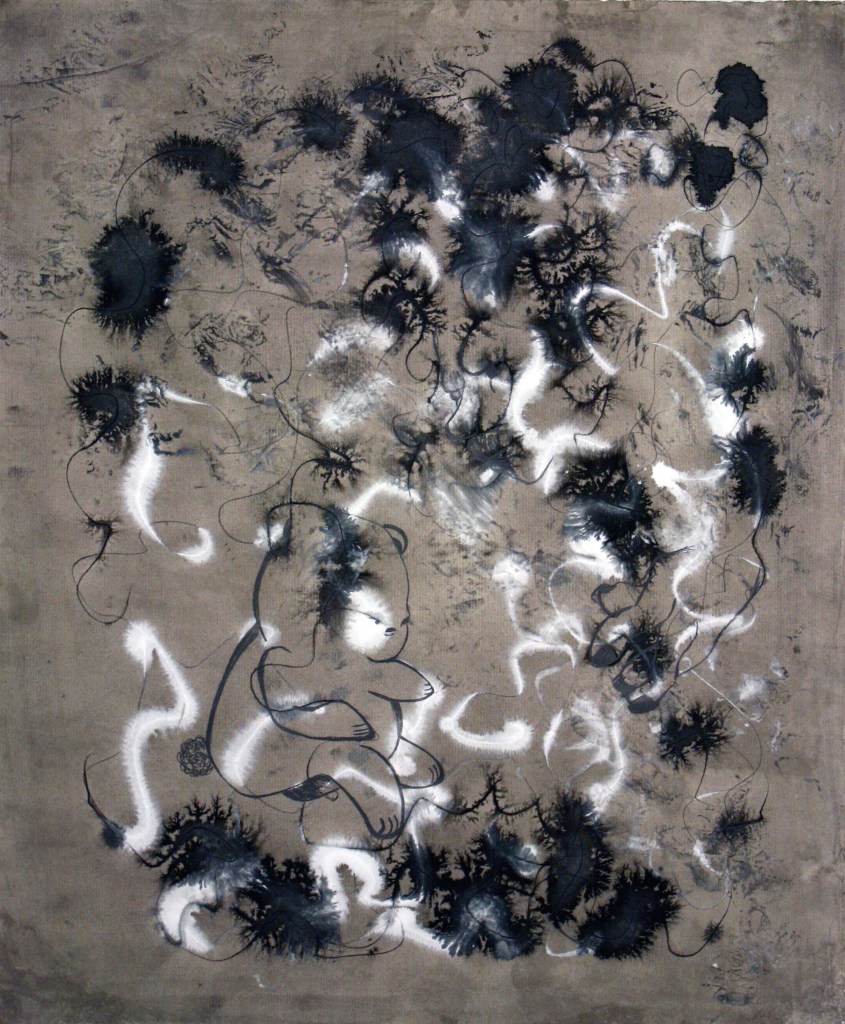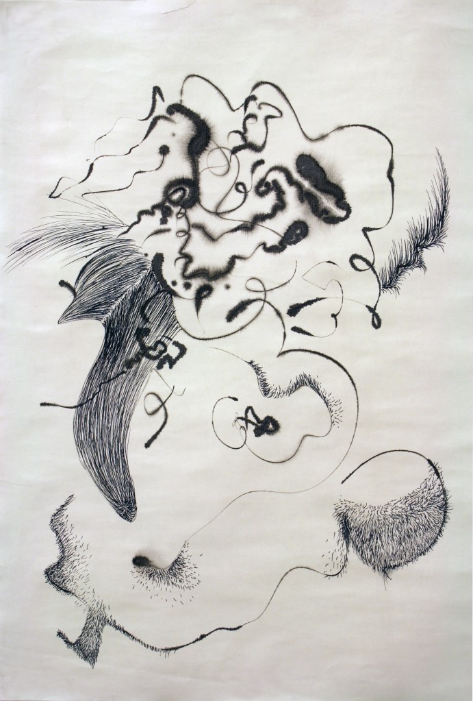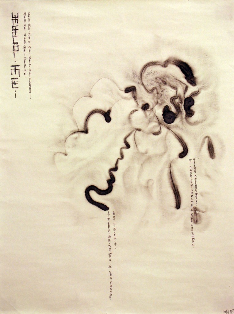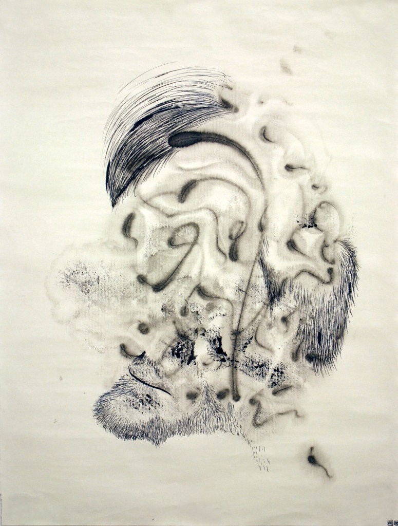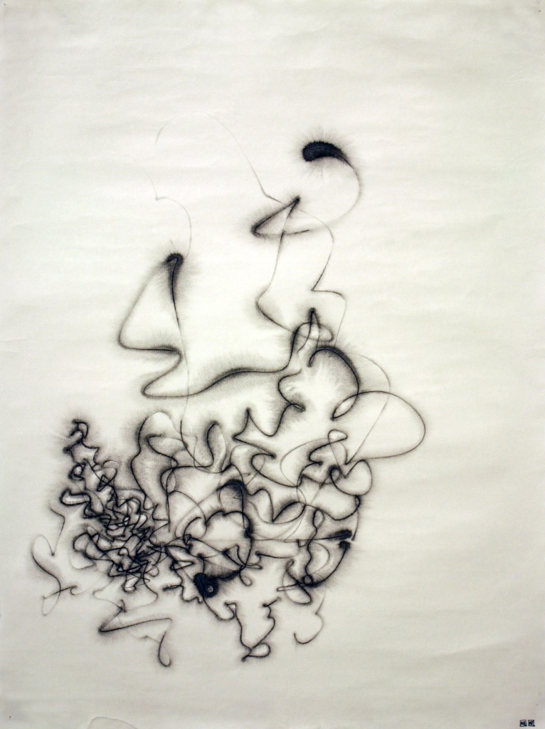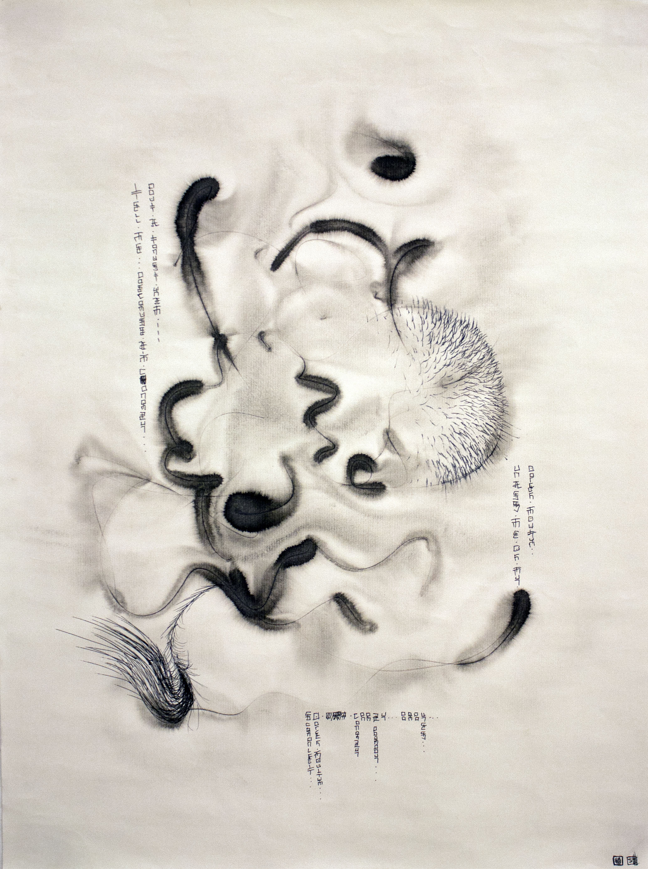 As for my drawings, I continue to allow my mind to create line works that inhabit a familiarity of human/organic forms: pareidolia. It becomes a playground for looseness and impulse. I write how I feel on these drawings, using them as a place to write out my issues and problems. When I am listening to music, it also drives a source of emotion in my motion of mark making. I write the lyrics to my soundtrack along my drawing documenting the song and how I feel. I write in a font I have created to reflect my wanting for my culture to be revered as another Asian ethnicity. I continually experiment with water mediums and explore the fluidity of my emotions.